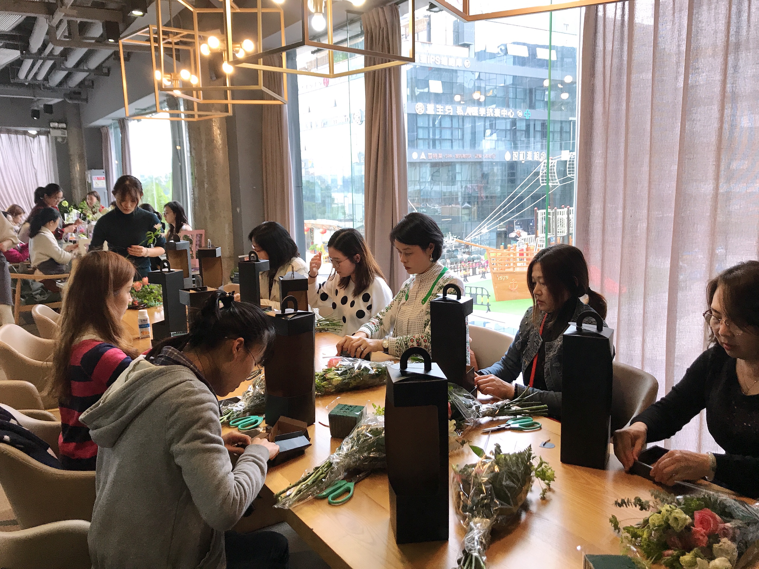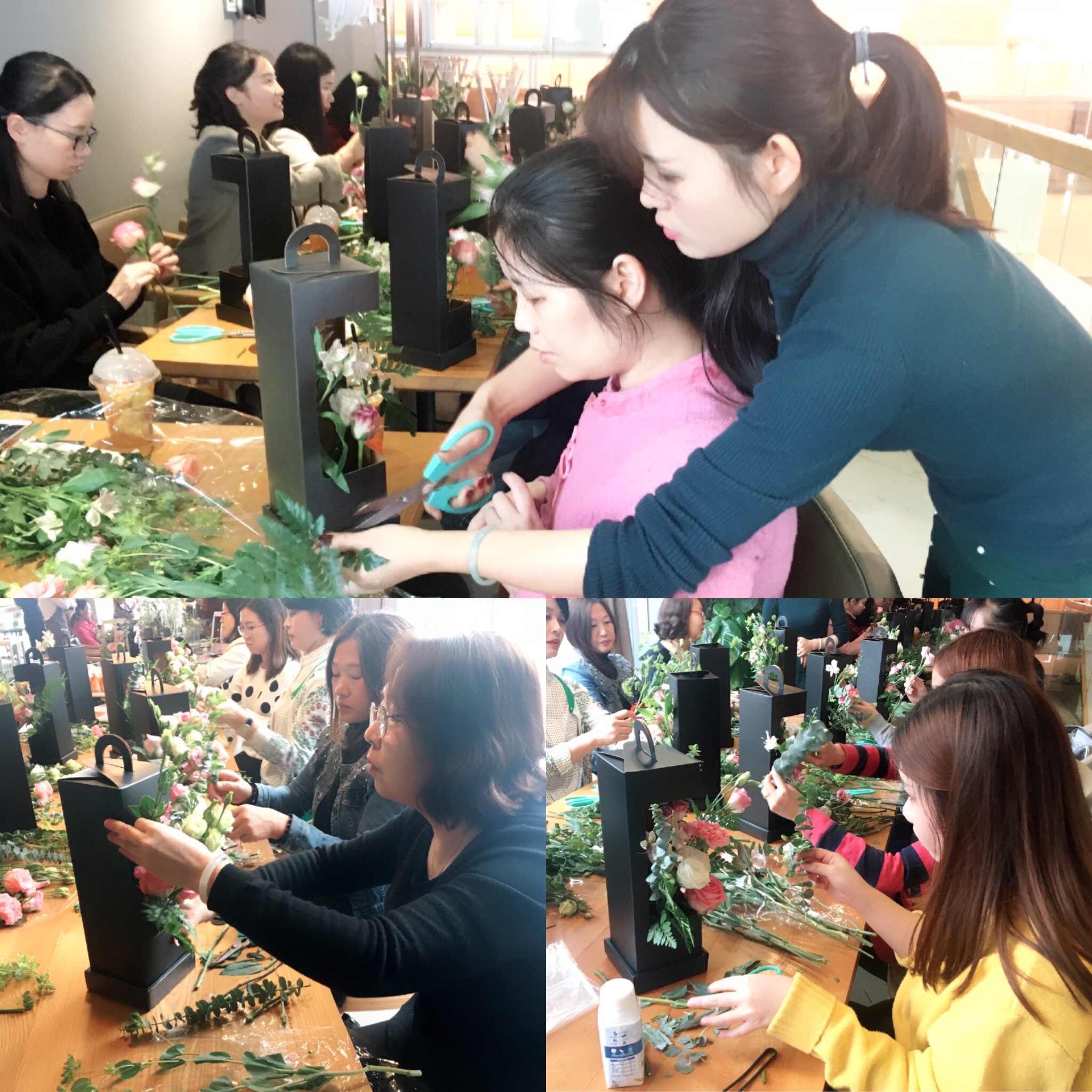 根據(jù)老師的指導(dǎo),大家紛紛欲試,將各式花材精心修剪、整合造型,不時(shí)還互相交流,彼此出主意。每個(gè)人都沉浸在花藝的世界里,饒有興致地創(chuàng)作著,現(xiàn)場(chǎng)洋溢著歡樂(lè)溫馨的氣氛。